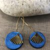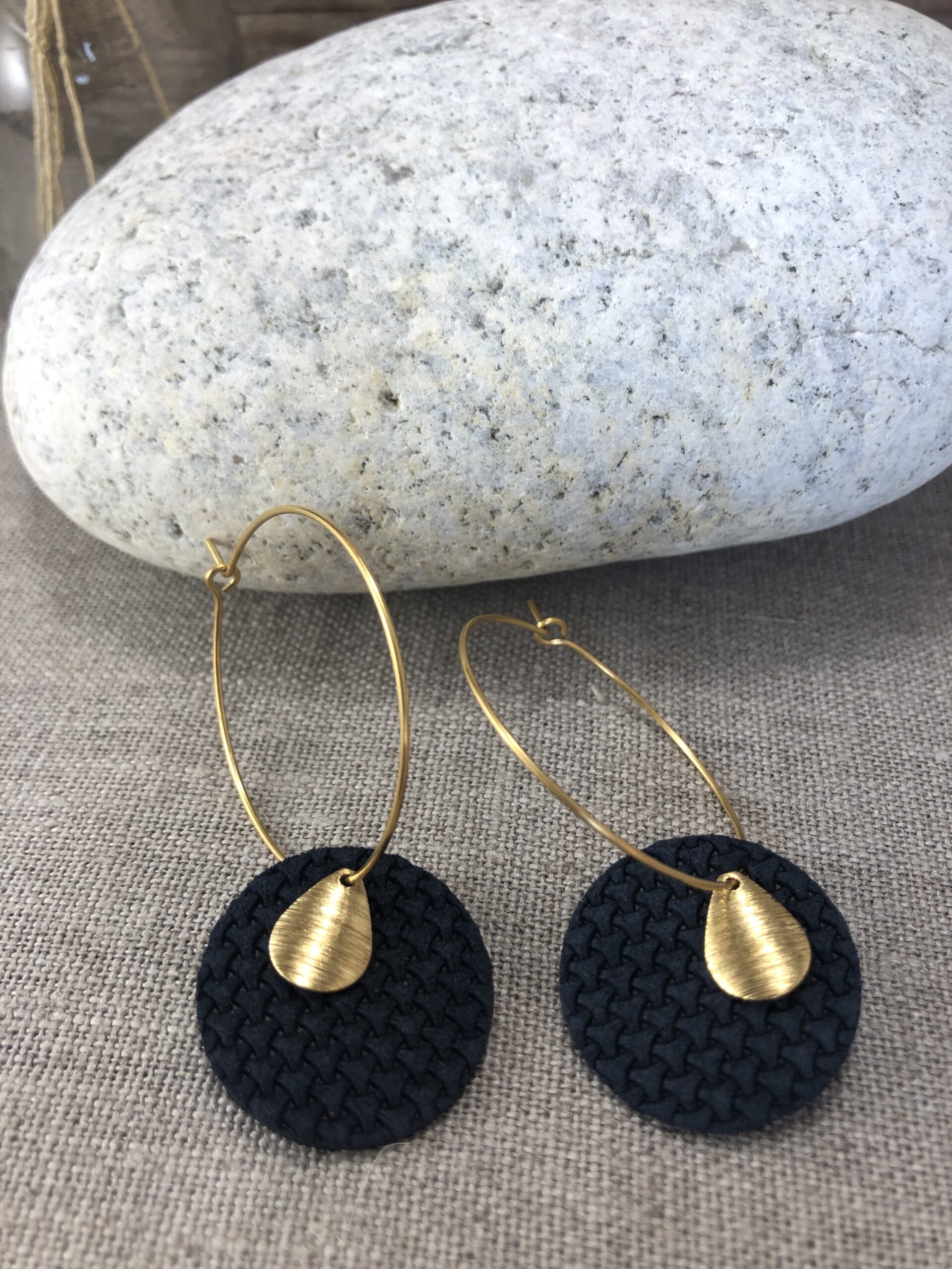 Créoles dorées avec pastilles cuir bleu marine texturé et breloque dorée.
