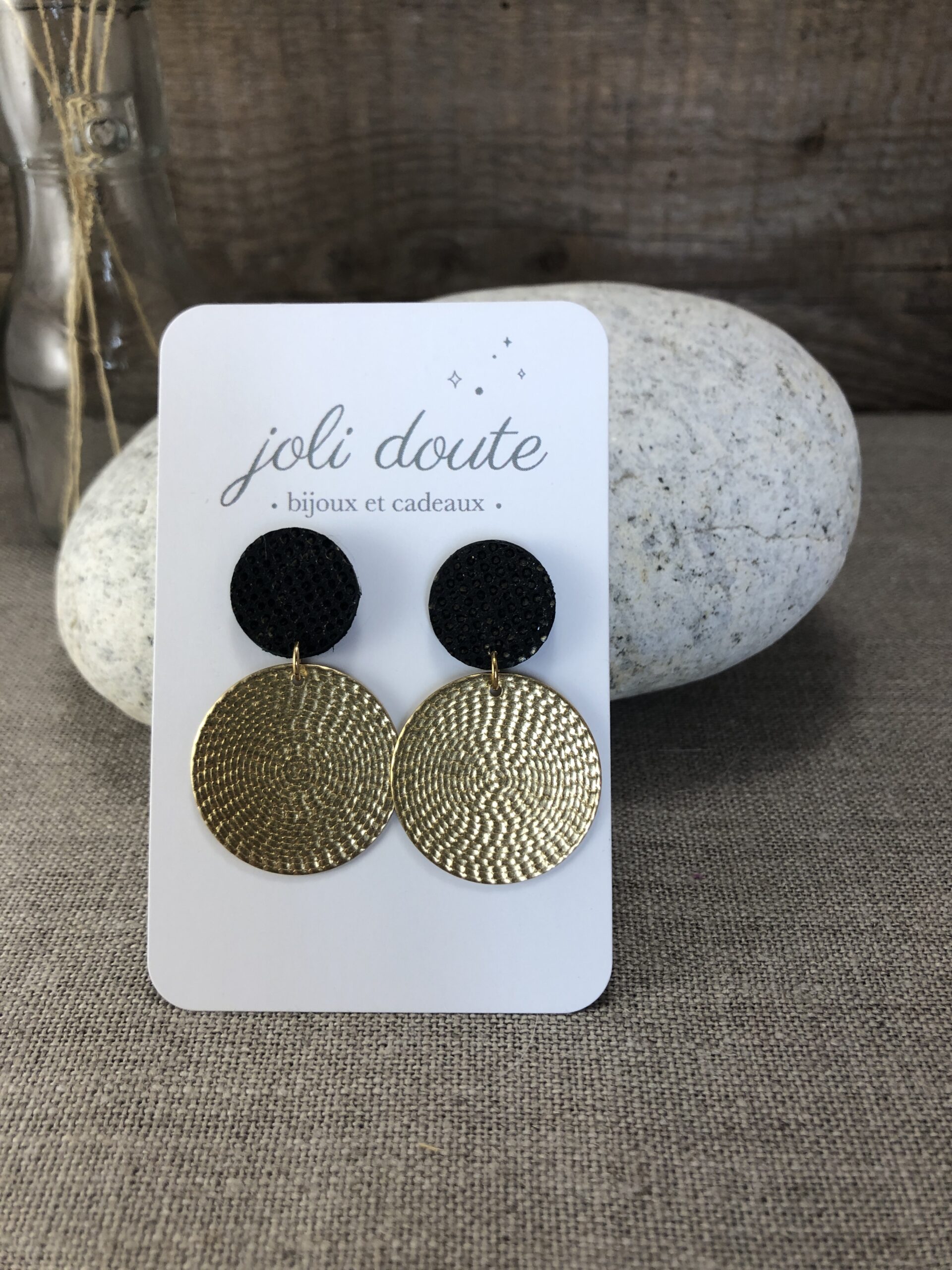Boucle d’oreilles avec clou cuir noir texturé et rond 25 mm doré tressé.