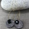 Boucles d’oreilles avec carré de pâte fimo verte, breloque bronze et perles heishi noires.