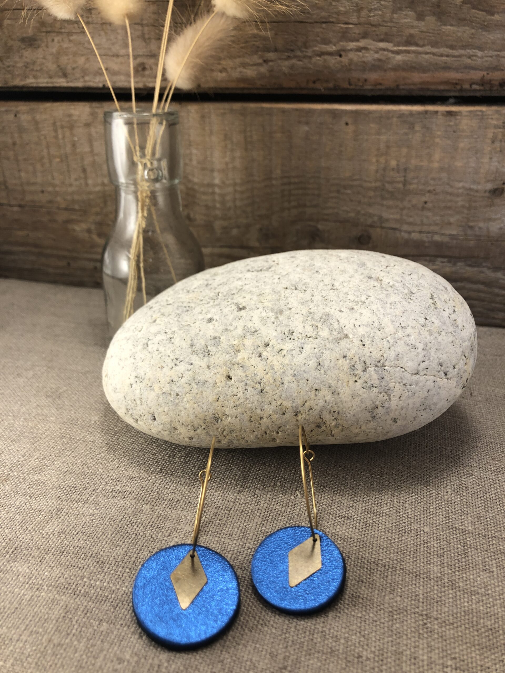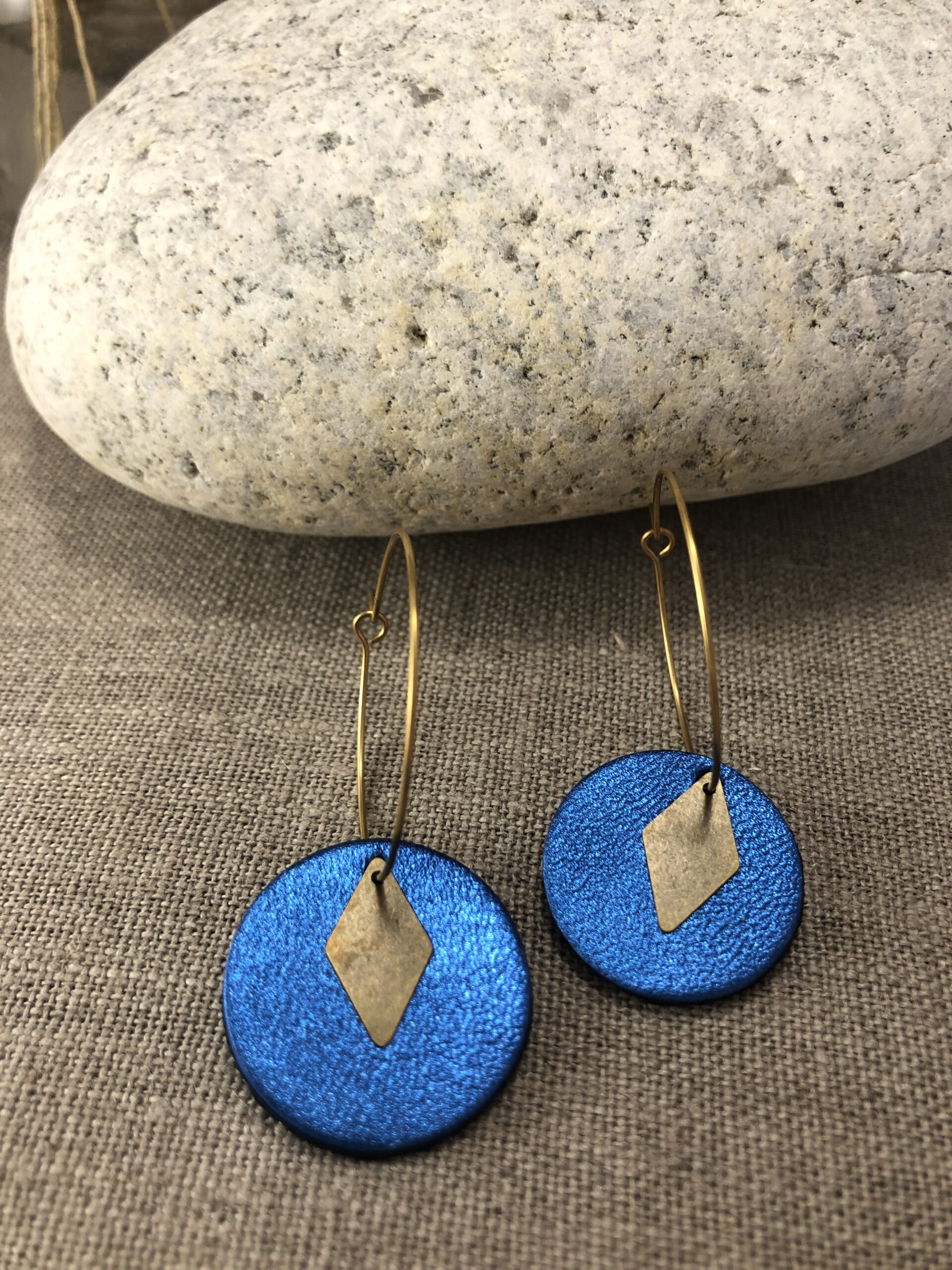 Créoles dorées avec pastilles cuir bleu irisé et breloque bronze.