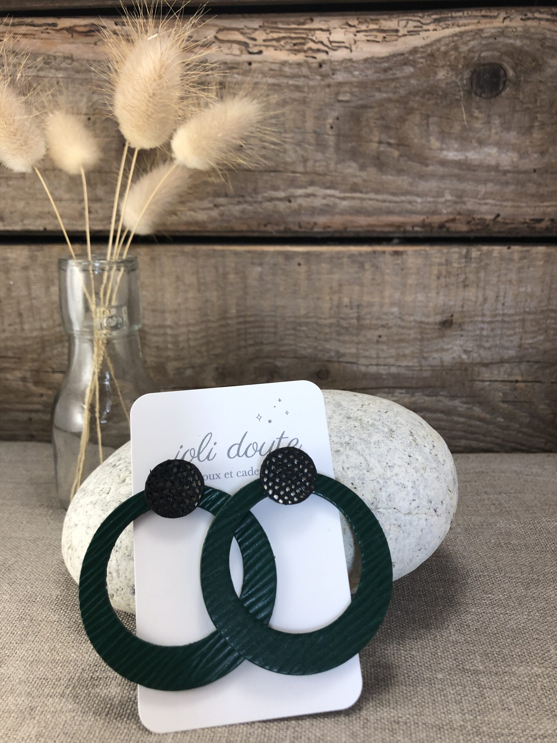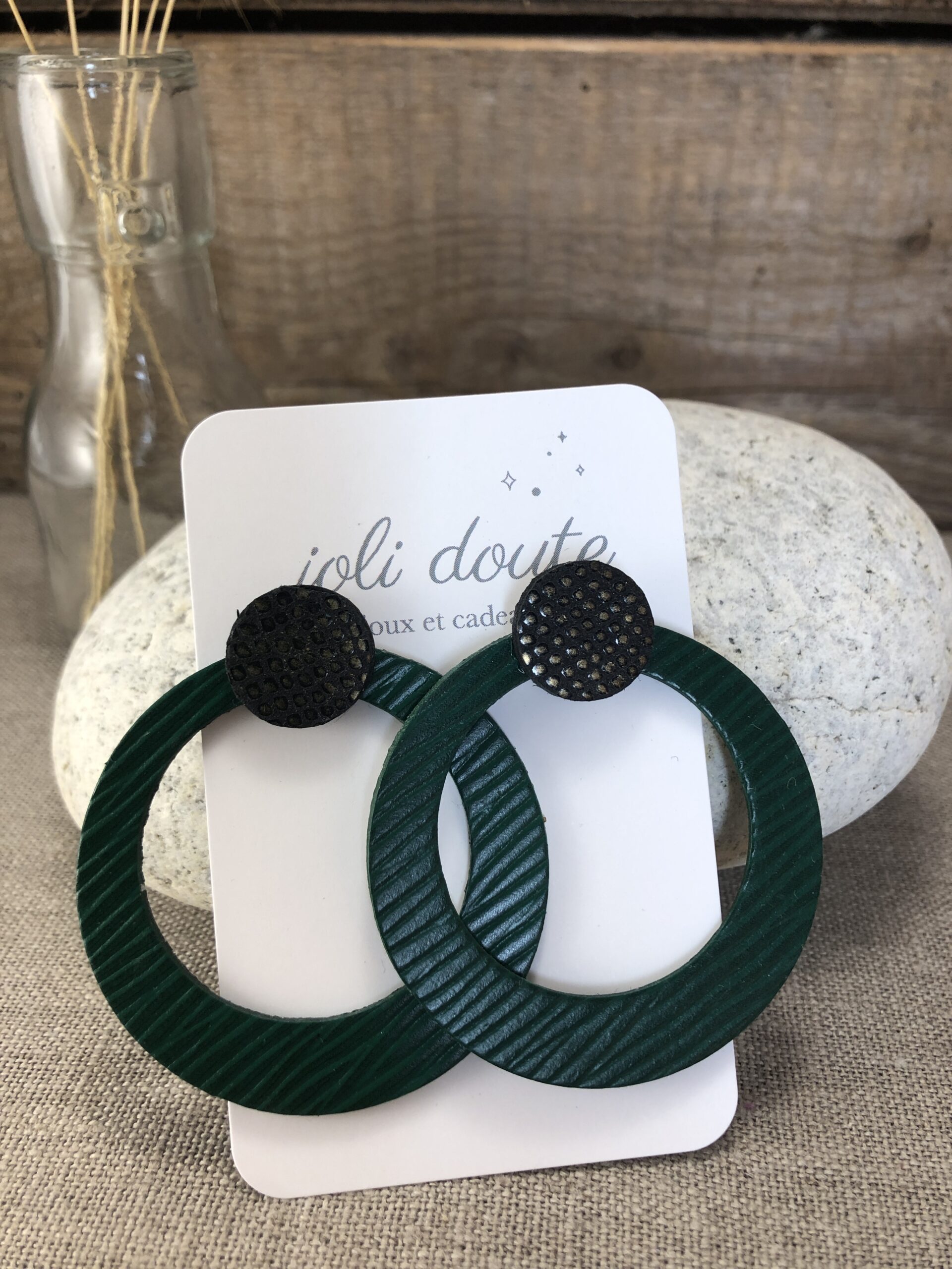 Grandes boucles créoles cuir vertes , avec clous acier inoxydable avec pastilles de cuir noir et doré.