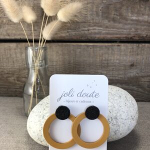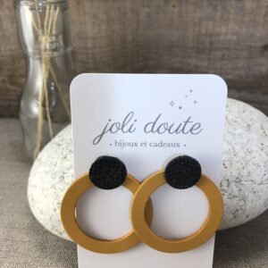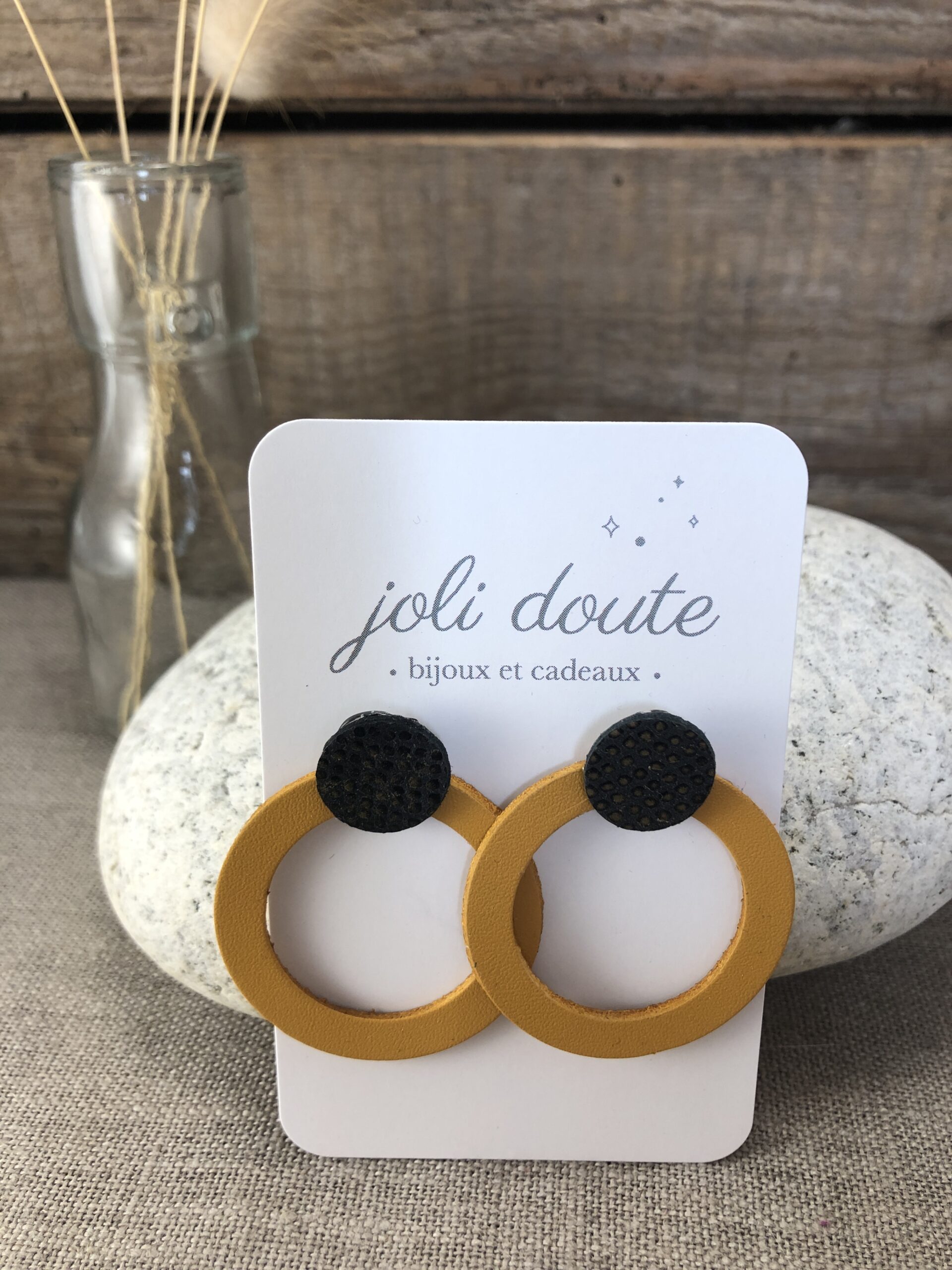 Petites boucles créoles cuir jaune , avec clous acier inoxydable avec pastilles de cuir noir et doré.