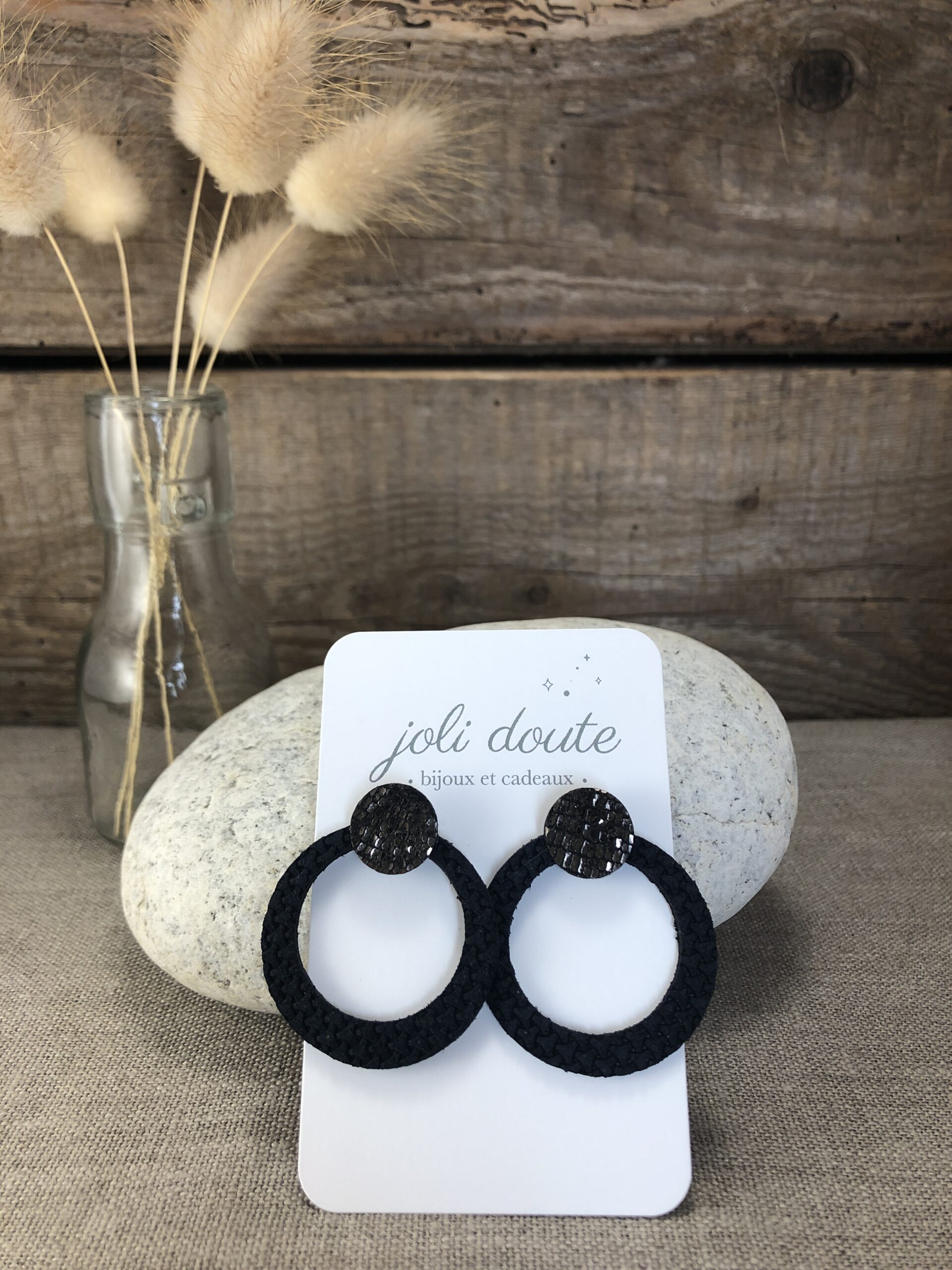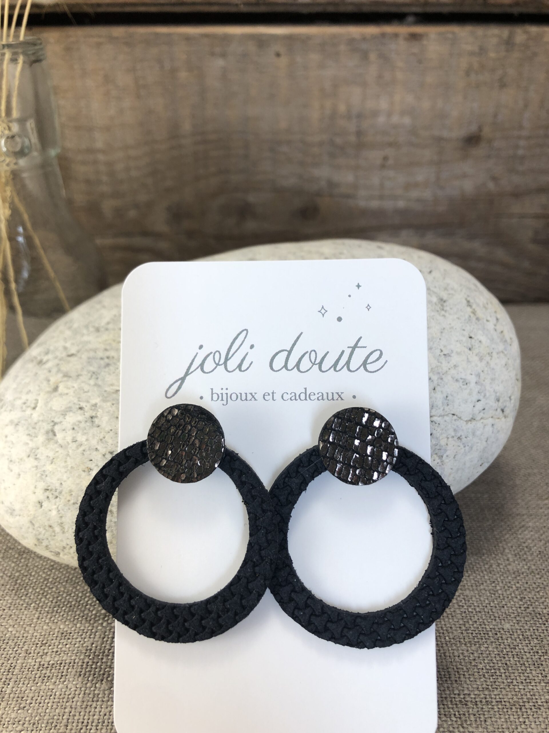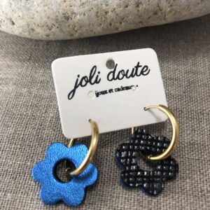 Petites boucles créoles cuir marine texturé , avec clous acier inoxydable avec pastilles de cuir doré.